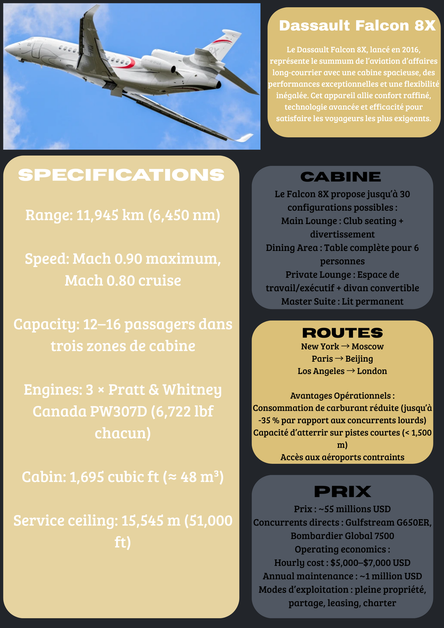 Plus qu’un avion, le Falcon 8X est une icône de l’aviation d’affaires moderne, un modèle qui reflète la passion, la précision et l’excellence française dans le domaine aéronautique.
