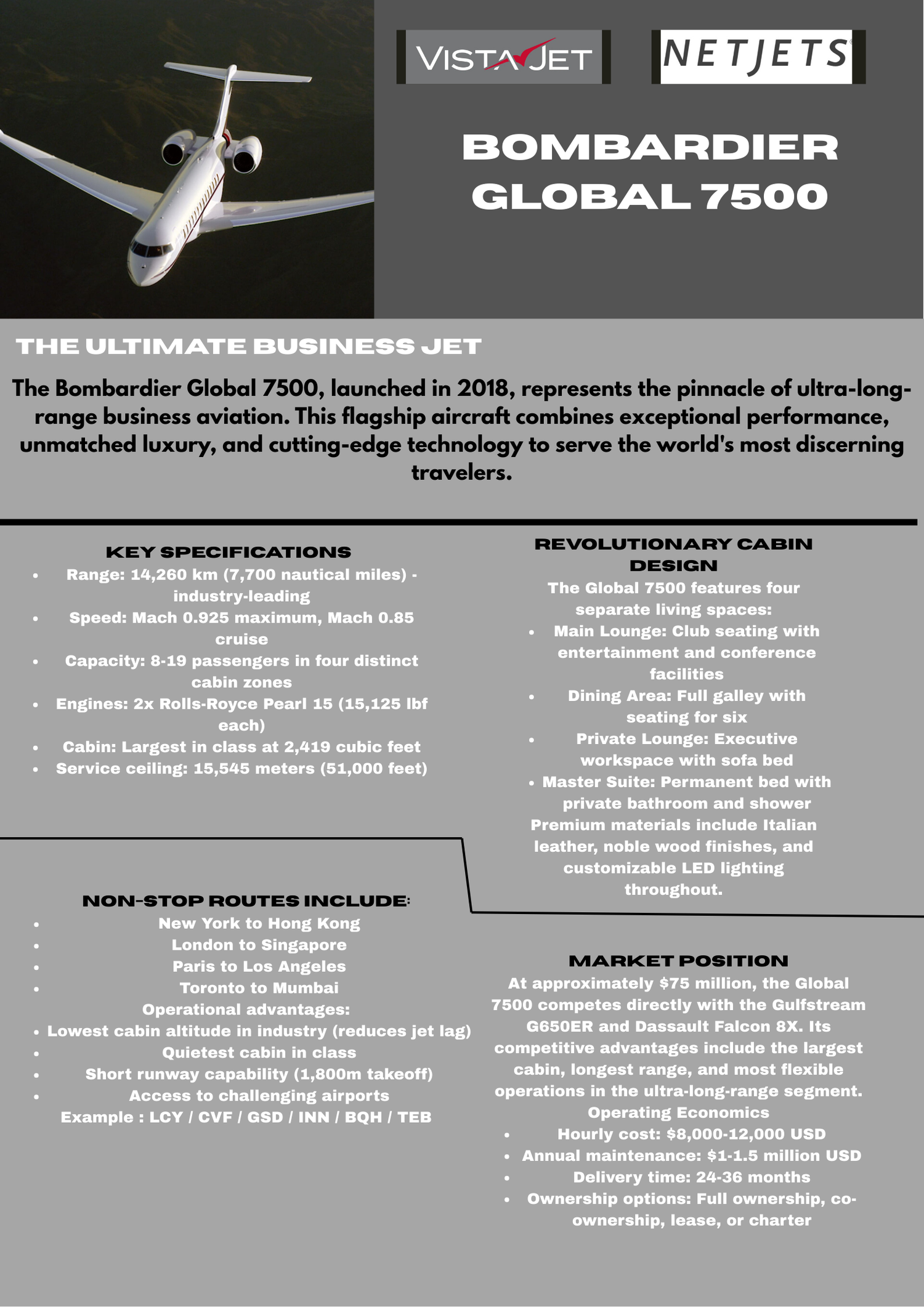 Un trio incontournable qui associe histoire, innovation et élégance : la légende du ciel avec le 747, le prestige français avec le Falcon 8X et l’innovation canadienne avec le Global 7500.